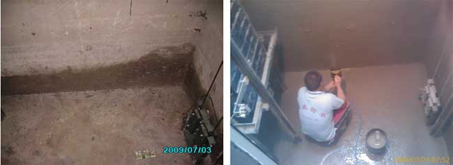 根据现场条件,为降低对周边环境的影响,缩短工期,降低施工成本,保证无渗漏整体效果,决定采用华鑫高空的专业内防水技术,特种材料,设计结构补强加固、抗渗堵漏的处理方案,即不进行外部的开挖,从室内施工,采用YYA防水抗渗、YY16闪凝堵漏补强、YY17止水抗渗、YYR伸缩缝专用密封堵漏、YY36防水抗裂密封等特种耐候抗渗材料施工,构建一个高强度的多重防水抗渗系统,彻底解决渗漏水的问题。